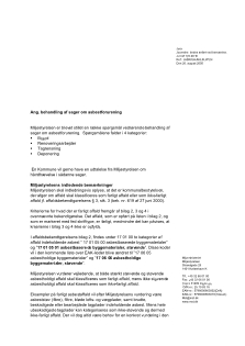 Hvis kommunen har godkendt oprydningen ud fra gældende praksis om oprydning af asbest med fjernelse af synlige stykker samt støvsugning med specialstøvsuger til asbest, kortlægges arealet ikke. Regionen skal ikke orienteres om oprydningen, hvis den foretages umiddelbart efter spildet er sket, og er godkendt af kommunen, da asbesten ved kortvarig kontakt med jorden vurderes ikke at være blevet en del af jordmediet, og derfor ikke betragtes som jordforurening. Kortlægning af asbestholdigt materialeVed indsamling af fragmenter af asbestholdigt materiale >20 mm i/på jorden anses det foreslåede jordkvalitetskriteriet for overholdt, hvis der max kan indsamles 50-75 g asbestholdigt materiale pr. m2, med et indhold på 10-15 % asbest. Ved overskridelse kortlægges på V2. Fragmenter af asbestholdigt materiale kaldes også ACM. Det kan fx være eternitstykker. PrøvetagningVores retningslinjer for prøvetagning tager udgangspunkt i den såkaldt hollandske metode, som også er beskrevet i Miljøprojekt nr. 1360 fra 2011. Arealet som skal undersøges, deles i områder af max. 200 m2. Inden for hvert delareal laves en blandeprøve af 5 nedstik udtaget 0-5 cm under terræn. Grundet asbestfibrenes lave mobilitet, er det væsentligt at overholde den ringe prøvetagningsdybde. I realiteten bliver det nødvendigt at lave mange flere end 5 nedstik, da analysemetoden kræver 10 kg jord pr. prøve. ReferencerMST-brev 26. august 2005: Behandling af sager om asbestforurening |